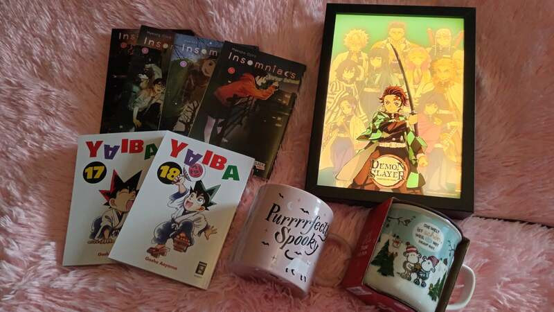 Unter den Geschenken waren natürlich noch ein paar Mangas mehr. So geht es für mich mit Insomniacs After School weiter, denn ich bekam die Bände 7 bis 10. Dann geht noch Yaiba mit den Bänden 17 und 18 in die nächste Runde. Am meisten überrascht hat mich jedoch ein anderes Geschenk. Es handelt sich um die schicke Lampe von Demon Slayer: Kimetsu no Yaiba. Sie ist recht groß und kommt in der Form eines Bilderrahmens. Wenn das Licht ausgeschaltet ist, dann sieht man nur den Charakter Tanjiro. Wenn man das Licht anmacht, dann sieht man alle anderen Charaktere dahinter. Das Licht kann eingestellt werden, wenn man wärmeres oder kälteres Licht bevorzugt. Auch heller und dunkler kann beim Licht eingestellt werden. Ich bin begeistert von der Lampe und freue mich sehr über das Geschenk. Zu guter Letzt habe ich noch zwei Tassen abgelichtet, die unter den Geschenken waren. Eine Tasse ist für Halloween mit einer Spooky Katze. Bei dieser war noch ein Einkaufsbeutel dabei, denn es war ein Set. Die andere Tasse kommt von Sheepworld mit dem Spruch „Die Welt ist schön, weil Du mit drauf bist“. Ich liebe die Tassen. Vielen Dank für die ganzen tollen Geschenke.