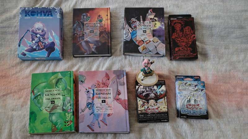 Dank des neuen Manga Issho konnte ich nicht anders und habe mir auch Kohva in der Collectors Edition geholt. Die Side Story ist halt richtig gut gemacht und ich wollte mehr über die Welt lernen. Konata ist die spanische Mangaka dahinter und sie muss sich wirklich nicht hinter den japanischen Kollegen verstecken. Bin gespannt, wohin die drei geplanten Bände die Geschichte bringen. Die letzen Mangas für den Monat waren ein Geburtstagsgeschenk für mich selbst. Habe mir nämlich die mir noch fehlenden Mobile Suit Gundam: The Origin Bände geholt. Zu sehen hier sind Band 9 bis 12, Band 8 war leider noch unterwegs während der Feiertage. Ebenfalls ein Geburtstagsgeschenk war die Anya-Figur, diesmal aber von meinem Bruder. Habe mich richtig gefreut, als ich die von ihm bekommen habe. Und ganz überraschend haben sich diesmal auch noch Yu-Gi-Oh!-Karten in den Loot geschlichen, weil die bei einem lokalen Geschäft im Abverkauf waren. Gerade über die Decks aus der 5D-Serie freue ich mich wirklich. Die anderen zwei habe ich mitgenommen, weil sie mich optisch angesprochen haben. Diese Decks sind auch immer wieder für einen Brettspiel-Abend gut.