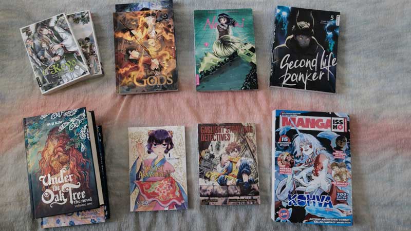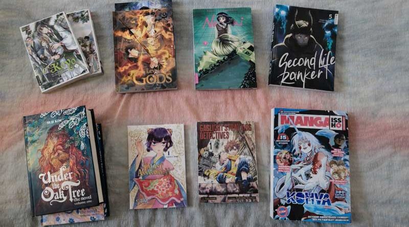 Und das war es immer noch nicht mit den Mangas. Koyo – Die exzentrische Ärztin des Mondblumenreichs Band 6 und 7 und Level up with the Gods Band 2 und 3 erzählen ihre Geschichten weiter. Ebenso wie Second Life Ranker Band 5 und Nezumi – Willst du mit mir morden gehen? Band 3 die Storys weiterbringen. Bei Nezumi muss ich aber noch immer eine Warnung an die Zartbesaiteten unter den Lesern aussprechen. Die Serie bleibt richtig spannend, aber man muss weiterhin explizite Gewalt vertragen können. Manga Issho geht mittlerweile in die vierte Runde und bleibt weiterhin ein Vorzeigeprojekt. Ich empfehle wirklich jedem Manga-Fan, einfach mal eine der Ausgaben zu holen und zu lesen. Wirklich der beste Beweis, wie hoch die Qualität der Mangaka in Europa mittlerweile ist. Zwei Serien, die ich spontan mitgenommen habe, sind Gaslight Stray Dog Detectives und Der Palast der Assassinen. Die Cover haben mich sehr angesprochen und wir haben einmal eine Geschichte, in der Sherlock Holmes eine Nebenfigur ist, und einmal eine, die wieder deutlich Leute wie mich anspricht, die Freude an den Abenteuern einer gewissen Apotherkerin haben. Man könnte ein Muster erkennen. Eine koreanische Novel ist diesmal auch dabei mit den ersten beiden Bänden von Under the Oak Tree. Hier kenne ich eigentlich nur den Webtoon, aber der hat mich so überzeugt, dass ich mir jetzt auch die englische Ausgabe der Novels holen musste. Romanzen und Fantasy mag ich eigentlich recht gerne und die Serie ist auf jeden Fall eine der besseren in diesen Genres.
