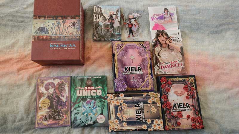 Dieses Mal ist der Loot besonders groß durch eine Kombination aus Nachzüglern der Black Week-Bestellungen, meinem Geburtstag und Weihnachten. Deswegen fangen wir vielleicht zuerst mit den coolen neuen Limited- und Collector-Editions von ein paar Mangas an. Mit dem Band 4 im Schuber bestitze ich jetzt endlich Nausicaä aus dem Tal der Winde komplett in dieser schönen Hardcover-Sammlung von Carlsen. Dann gab es mit Die letzte Elfe meinen ersten Manga vom Verlag Yomeru. Die Limited Edition kam hier mit einem Acyryaufsteller der Hauptfigur Aharu. Der Band ist schon gelesen und bekommt eindeutig eine Empfehlung von mir. Ebenfalls mit Acrylaufsteller kam die Limited Edition von Yandere Dark Elf an. Erschienen beim ganz neuen Verlag Manga Moon, dem neuen Manga-Label des bekannten Anime-Publishers AniMoon und sie wollen sich mit ihren Lizenzen an ein paar gewagtere Titel wagen. Der hier hat es mir auf jeden Fall schon angetan. Dann habe ich mir noch die Collectors Edition zu den ersten drei Bänden von Kiela und das letzte Geleit geholt. Der Manga von Sozan Coskun erscheint bei Altraverse und die Mangaka ist mir durch den IKIGAI-Podcast bekannt, wo sie eine der Hosts ist. Ich glaube das Cover von Band 3, hat mich angefixt und tolle, europäische Werke unterstütze ich vor allem dank Manga Issho sehr viel mehr als zuvor. Ein Manga fürs jüngere Publikum ist Unico wird gejagt Band 2, aber Gurihirus Zeichnungen und die Geschichte können von allen Altersgruppen genossen werden. Die schöne Hardcover-Ausgabe zum tollen Preise beim Loewe-Verlag ist natürlich auch ein Argument. Dann gab es noch einen neuen Webtoon mit The Perks of Being a Villainess. Digital kenne ich ihn schon und es ist eine gute Geschichte mit einer richtig starken Protagonistin und sehr schönem Artwork.