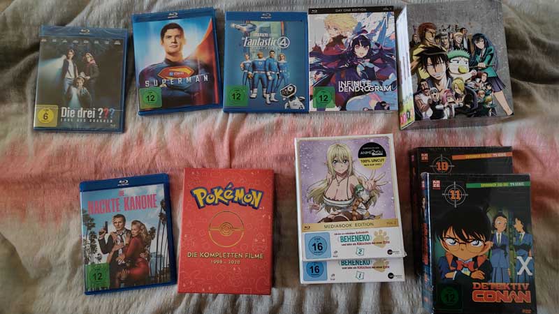 Abgeschlossen wird dieser Monat mit Bewegtbild-Produktionen. Die drei ??? – Erbe des Drachen habe ich ja schon letzten Monat erwähnt, der kam halt erst im Dezember an. Mit Black Week-Angeboten gab es einges an neuen Sachen. Dazu gehören auch zwei Superheldenfilme, die ich beide absolut empfehle mit Superman und Fantastic Four: First Steps. Beide sind ausgezeichnet, können ohne Vorwissen geschaut werden und funktionieren wunderbar auch als eigenständige Filme. Animes in der Black Week gab es auch noch. Allen voran freue ich mich über alle 60 Folgen von Beelzebub zum absoluten Schnäppchen-Preis. Zwei weitere Volumes von Detektiv Conan habe ich mir dann auch noch gegönnt und von Animoon gab es mit Beheneko Volume 1 und 2 sowie Infinite Dendrogram ebenfalls Animes, die ich mir holen wollte zum vergünstigten Preis. Die letzten zwei Artikel sind mit Die Nackte Kanone einmal ein Film, bei dem ich nicht mehr dazu kam, den im Kino zu schauen und mit Pokémon – Die Kompletten Filme 1998–2020 ein Sammlung aller Filme mit Ash Ketchum als Protagonist. Damit ist der Riesen-Loot für dieses Monat komplett und ich muss nur noch Zeit finden, das alles zu lesen oder zu schauen.