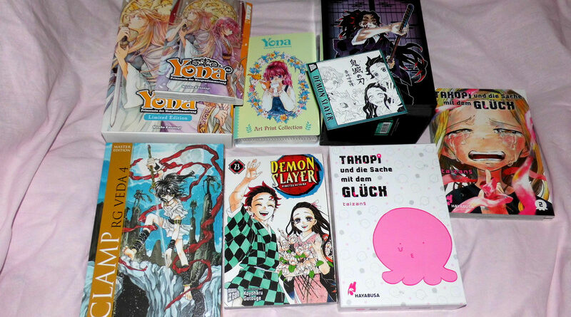 Yona – Prinzessin der Morgendämmerung ist inzwischen bei Band 40 angelangt. Dies wird von Tokyopop mit einer Art Print Collection gefeiert. In der limitierten Edition sind somit 40 Art Prints und ein Sammelalbum enthalten. Mal ein wirklich schönes Extra, denn die ständigen Kalender waren langweilig. Muss aber sagen, dass ich bei der Reihe echt hinterherhänge und noch viel nachkaufen müsste. So langsam wäre es gut, wenn sie auf das Ende zugehen würde. Bei Demon Slayer: Kimetsu no Yaiba sieht es anders aus, denn das ist inzwischen mit Band 23 abgeschlossen. Zum Abschluss gibt es nochmal einen schicken Sammelschuber und eine Signierkarte. Ich finde es erfreulich, dass man den Erfolg nicht dazu ausgenutzt hat, die Reihe ewig laufen zu lassen. Ich würde aber gerne eine neue Serie von Koyoharu Gotouge lesen. Bei RG Veda fehlte mir noch der vierte Band und so habe ich mir diesen noch schnell besorgt, denn man kriegt ihn kaum noch irgendwo zu kaufen. Den fünften hatte ich mir schon vor langer Zeit geholt, als Manga Cult ankündigte, dass dieser vergriffen sein würde. Bin jetzt wirklich glücklich, dass ich die Reihe nun komplett habe. Zu guter Letzt gibt es für mich noch den Abschlussband von Takopi und die Sache mit dem Glück. Es gibt bei dem Titel auch eine limitierte Variante mit Sammelschuber und da habe ich zugegriffen. Bin begeistert, der Schuber ist sehr stabil und hochwertig.
