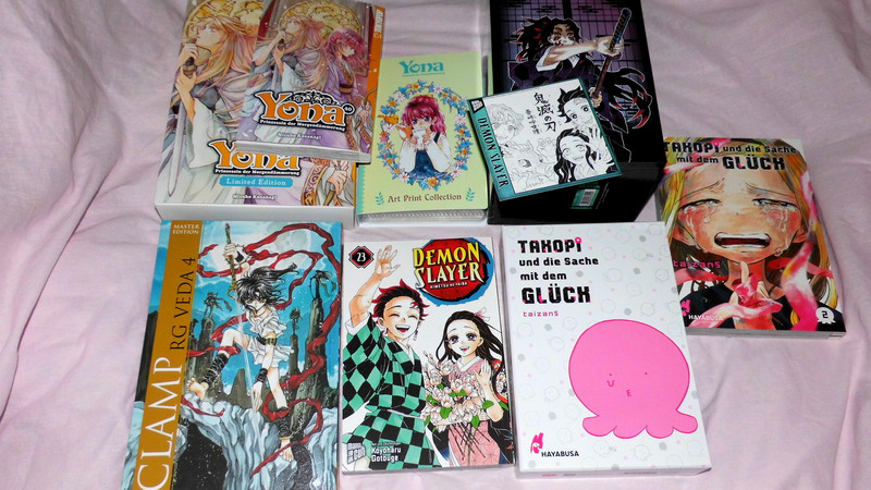 Yona – Prinzessin der Morgendämmerung ist inzwischen bei Band 40 angelangt. Dies wird von Tokyopop mit einer Art Print Collection gefeiert. In der limitierten Edition sind somit 40 Art Prints und ein Sammelalbum enthalten. Mal ein wirklich schönes Extra, denn die ständigen Kalender waren langweilig. Muss aber sagen, dass ich bei der Reihe echt hinterherhänge und noch viel nachkaufen müsste. So langsam wäre es gut, wenn sie auf das Ende zugehen würde. Bei Demon Slayer: Kimetsu no Yaiba sieht es anders aus, denn das ist inzwischen mit Band 23 abgeschlossen. Zum Abschluss gibt es nochmal einen schicken Sammelschuber und eine Signierkarte. Ich finde es erfreulich, dass man den Erfolg nicht dazu ausgenutzt hat, die Reihe ewig laufen zu lassen. Ich würde aber gerne eine neue Serie von Koyoharu Gotouge lesen. Bei RG Veda fehlte mir noch der vierte Band und so habe ich mir diesen noch schnell besorgt, denn man kriegt ihn kaum noch irgendwo zu kaufen. Den fünften hatte ich mir schon vor langer Zeit geholt, als Manga Cult ankündigte, dass dieser vergriffen sein würde. Bin jetzt wirklich glücklich, dass ich die Reihe nun komplett habe. Zu guter Letzt gibt es für mich noch den Abschlussband von Takopi und die Sache mit dem Glück. Es gibt bei dem Titel auch eine limitierte Variante mit Sammelschuber und da habe ich zugegriffen. Bin begeistert, der Schuber ist sehr stabil und hochwertig.