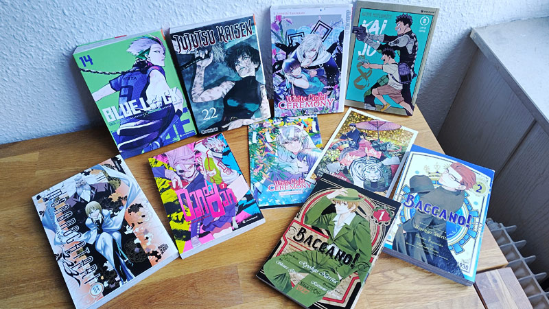 Nach 22 Bänden erreichte ich den aktuellen Stand der Light Novel-Reihe Baccano!. Da im letzten Band ein Ereignis erwähnt wird, das nur in der Manga-Reihe vorkommt, wanderten die Bände alle brav in den Warenkorb. Volume 1 und 2 erreichten mich auch schon. Schade ist, dass beide Bände schon ein bisschen, also minimal am Einband, beschädigt sind. Nun gut, es sind englische Bände und die haben einen sehr langen Weg hinter sich. Kaiju No.8 Band 8 – endlich passt einmal die große 8 auf dem Cover, hihi – erschien in einer normalen und limitierten Edition. Bei der schönen Zusatzkarte musste ich mich für letzteres entscheiden. Ein wirklich schönes Motiv und mit der Goldfolie macht das Stück ordentlich was her. Mir gefällt auch das alternative Cover sehr gut. Bei White Light Ceremony entschied ich mich auch wieder für die Sonderedition. Ich wollte das Beiheft einfach wieder haben, denn da ist immer eine nette Bonusgeschichte drin. Von den Crunchyroll-Manga-Reihen durften noch Jujutsu Kaisen, Dandadan und Blue Lock mit. Bereits der vierte Band von Mononogatari – Die Wächter der Artefaktgeister wanderte gekauft und gelesen ins Regal.