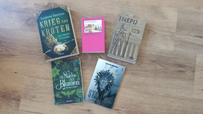 Mein März stand ganz im Zeichen der ausfallenden Leipziger Buchmesse und dem #bücherhamstern, der von Selfpublishern und Kleinverlagen auf Twitter und Instagram ins Leben gerufen wurde, um trotzdem Bücher zu verkaufen und die Verluste durch den Messeausfall zu minimieren. Deshalb wurden bei mir viele Bücher angeschafft. Besonders freue ich mich schon auf Krieg und Kröten von Susanne Pavlovic, da mir MadameMelli den Tipp gegeben hat, dass die Bücher der Autorin super sind. Auch ein tolles Buch, was bei mir einzieht, ist Inepu von Roxane Bicker. Ich bin schon gespannt, wie sich die Mischung aus ägyptischer Mythologie und Kriminalgeschichte lesen lässt. Sonst durfte auch Die Nacht der Blumen von Michaela Harich zu mir. In diesem Buch wird ein Märchen neuinterpretiert. Eine weitere besondere Entdeckung war für mich Stahllilie und der mechanische Löwe von Katharina Ushachov. Dieses Buch ist nicht nur ein Buch, sondern ein Light Novel. Bisher habe ich noch kein Light Novel gelesen und freue mich deshalb umso mehr auf das Lesen. Als letztes kommt noch das kleine pinke Reclambüchlein Geschichte Japans zu mir – dies hat vor allem Recherchegründe für meine aktuelle Romanidee.
