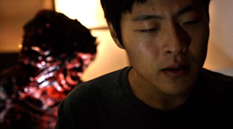 Der eigentliche Star sind die Hauptantagonisten, nämlich das Monster (hierfinden sich Anleihen an Clive Barker, H.P. Lovecraft und John Carpenter) und Mitsuo, der Besitzer des BnB. Schade ist, dass es von Tokio selbst vergleichsweise wenig zu sehen gibt. Bis auf ein paar Szenen in Nebenstraßen fängt Bakemono gar nicht viel von dem Treiben ein. Das wird mit Sicherheit auch auf entsprechend fehlende Drehgenehmigungen zurückzuführen sein und trotzdem ist es so, als würde etwas Wichtiges fehlen. Aber eigentlich geht es auch gar nicht um die Geschichten, sondern die Tode, die hier wie am Fließband stattfinden. Roos setzt auf viel Blut in seinen Gewaltszenen und verwendet dafür ausschließlich praktische Effekte anstatt Erzeugnisse aus dem Computer. Bakemono wird zu einem Härtetest mit Messerstechereien, Schnitten und Körperteilen, die auf die eine oder andere Weise von ihren Besitzern getrennt werden. Generell ist das Bild etwas dunkel geraten, da überwiegend auf künstliches Licht innerhalb des Appartements gesetzt wird. Das passt hingegen aber zu dem ohnehin düsteren und schmuddeligen Look der Kreatur, sodass das Bild oftmals mit seiner Sättigung an Schwarz wie aus einem Guss wirkt.