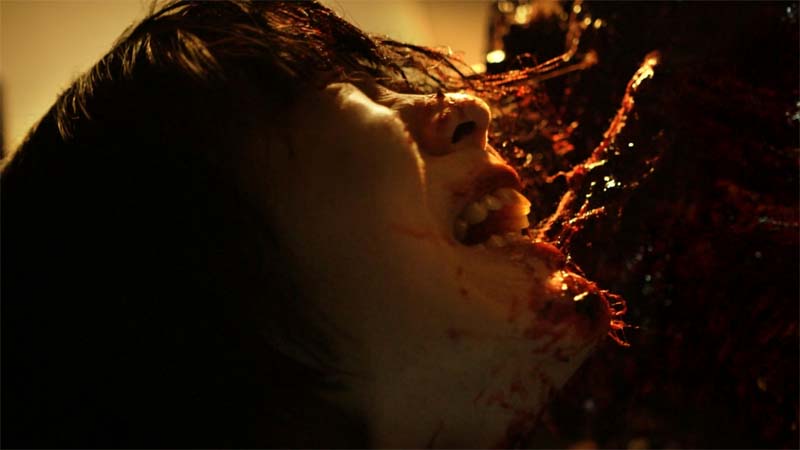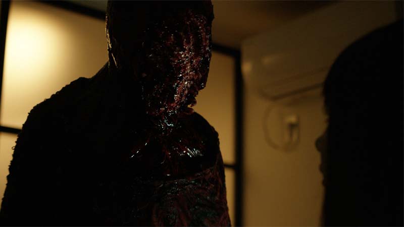 Der eigentliche Star sind die Hauptantagonisten, nämlich das Monster (hierfinden sich Anleihen an Clive Barker, H.P. Lovecraft und John Carpenter) und Mitsuo, der Besitzer des BnB. Schade ist, dass es von Tokio selbst vergleichsweise wenig zu sehen gibt. Bis auf ein paar Szenen in Nebenstraßen fängt Bakemono gar nicht viel von dem Treiben ein. Das wird mit Sicherheit auch auf entsprechend fehlende Drehgenehmigungen zurückzuführen sein und trotzdem ist es so, als würde etwas Wichtiges fehlen. Aber eigentlich geht es auch gar nicht um die Geschichten, sondern die Tode, die hier wie am Fließband stattfinden. Roos setzt auf viel Blut in seinen Gewaltszenen und verwendet dafür ausschließlich praktische Effekte anstatt Erzeugnisse aus dem Computer. Bakemono wird zu einem Härtetest mit Messerstechereien, Schnitten und Körperteilen, die auf die eine oder andere Weise von ihren Besitzern getrennt werden. Generell ist das Bild etwas dunkel geraten, da überwiegend auf künstliches Licht innerhalb des Appartements gesetzt wird. Das passt hingegen aber zu dem ohnehin düsteren und schmuddeligen Look der Kreatur, sodass das Bild oftmals mit seiner Sättigung an Schwarz wie aus einem Guss wirkt.
