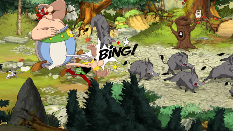All das fällt besonders dadurch auf, dass die Entwickler mit Blick auf Stil und Artdesign der Vorlage alle Register gezogen und Galleonen an Zaubertrank haben hineinfließen lassen. Wenn es in die Missionen geht, könnte man denken, alle Figuren, die sich mit comic’schen *Wack!*s und *Wamm!*s auf handgezeichneten Hintergründen gegenseitig Ohrfeigen verteilen, seien direkt Knöchel knackend den Comics oder Zeichentrickfilmen entstiegen. Ausnahmslos alle, vom wild armwedelnden Briganten über säbelschwingende Piraten hin zu den treudoof in ausgestreckte Hände hineinlaufende Legionäre, sind liebevoll gestaltet und fangen voll und ganz den Charm der Vorlage ein. Es wäre schön, den Punkt damit zufrieden nickend abzuschließen, aber ‚Aber‘ hat noch ein Wörtchen zu sagen. Aber: So fein das Auge auch an den Figuren schmaust, wirken die Hintergründe doch auf Dauer recht nährarm und leer, da man zumeist schlicht auf gepflasterten, steinigen, sandigen oder waldigen Pfaden dahermarschiert, die kaum die jeweils dargestellten Ortschaften hinausposaunen. Zudem dürfte sich selbst die hungrigste Pupille nach einer Weile an dem zwar gleich bleibend guten aber immergleichen Legionärsaufmarsch satt gesehen haben. Die Gegner-Assetts wiederholen sich trotz leichter Varianten untereinander so oft, dass man den Frauen die Quadrilliolinge zur Welt gebracht haben, nur sein herzliches Beileid wünschen kann.